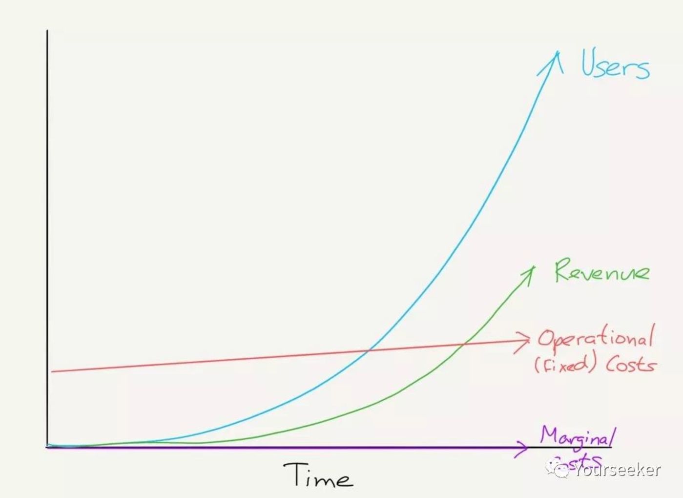 首先,所谓能够带来巨大回报的业务,一定得是那些边际成本够低的公司。因为到了后期,他们的用户、收入增长将远远快于成本增长,这样才能获得足够有意义的回报。如下图: